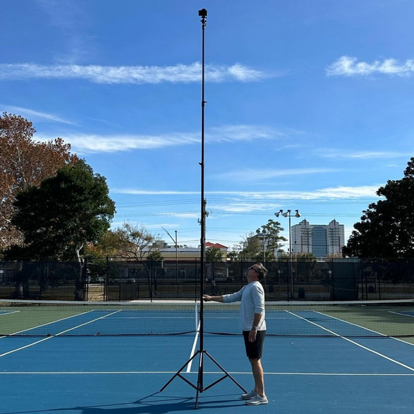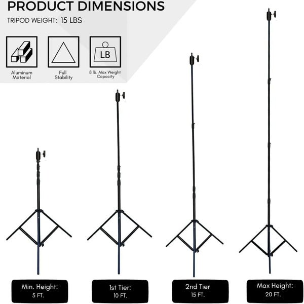 The Sky High 20’ Tripod is the ultimate tall camera stand for breathtaking overhead shots, sports events, and panoramic landscapes. Built from lightweight aluminum, it features five 4ft air-cushioned telescoping sections, allowing smooth height adjustments up to 20 feet. Designed for stability and versatility, it supports cameras up to 8 lbs and includes light and 1/4” mounting options for various setups. Whether you're a filmmaker, photographer, or content creator, this tripod lets you shoot from new heights with unmatched flexibility.