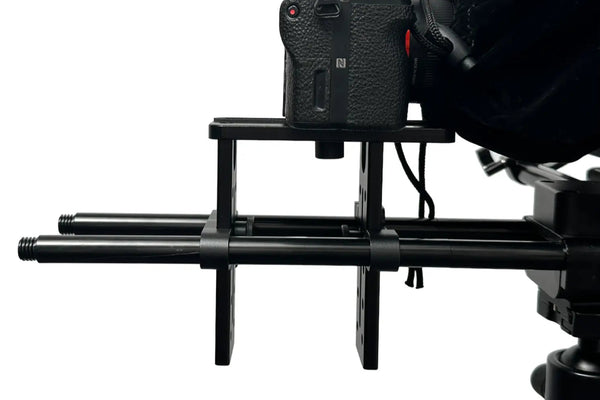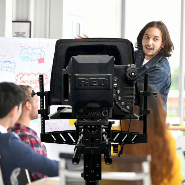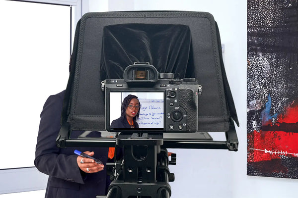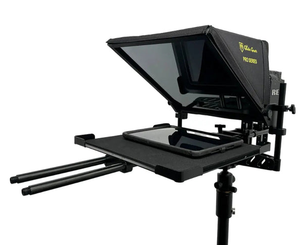The TMP 1000 Professional Tablet Teleprompter is our biggest and most tablet compatible teleprompter in production. It is designed for both mobile and studio setups. This durable 17" teleprompter is compatible with all tablets, including iPad Pro, Air, Mini, and original iPad, and features premium 70/30 beam-splitting glass, an adjustable glass height, and a cushioned tablet tray to fit any device. Built with a sturdy aluminum frame, it supports 15mm rod systems, multiple tripod configurations, and C-stand mounting. Its adjustable camera sled and hard plastic carry case make it the ultimate portable teleprompter for professional productions.